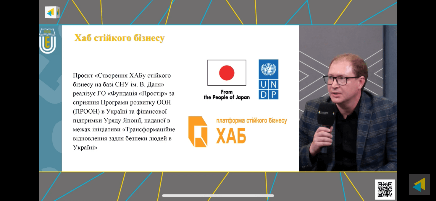 Під час другої панельної дискусії у якості спікера виступив Євген Івченко із презентацією Хабу стійкого бізнесу, що створюється на факультеті економіки і управління в межах проєкту «Створення ХАБу стійкого бізнесу на базі СНУ ім. В. Даля», який реалізує ГО «Фундація «Простір» за сприяння Програми розвитку ООН (ПРООН) в Україні та фінансової підтримки Уряду Японії, наданої в межах ініціативи «Трансформаційне відновлення задля безпеки людей в Україні». Євген Івченко підкреслив важливість створення майданчику взаємодії університету з бізнесом та громадою для підтримки релокованих підприємств, підприємців, ВПО та ветеранів, які мають бажання щодо започаткування власної справи.