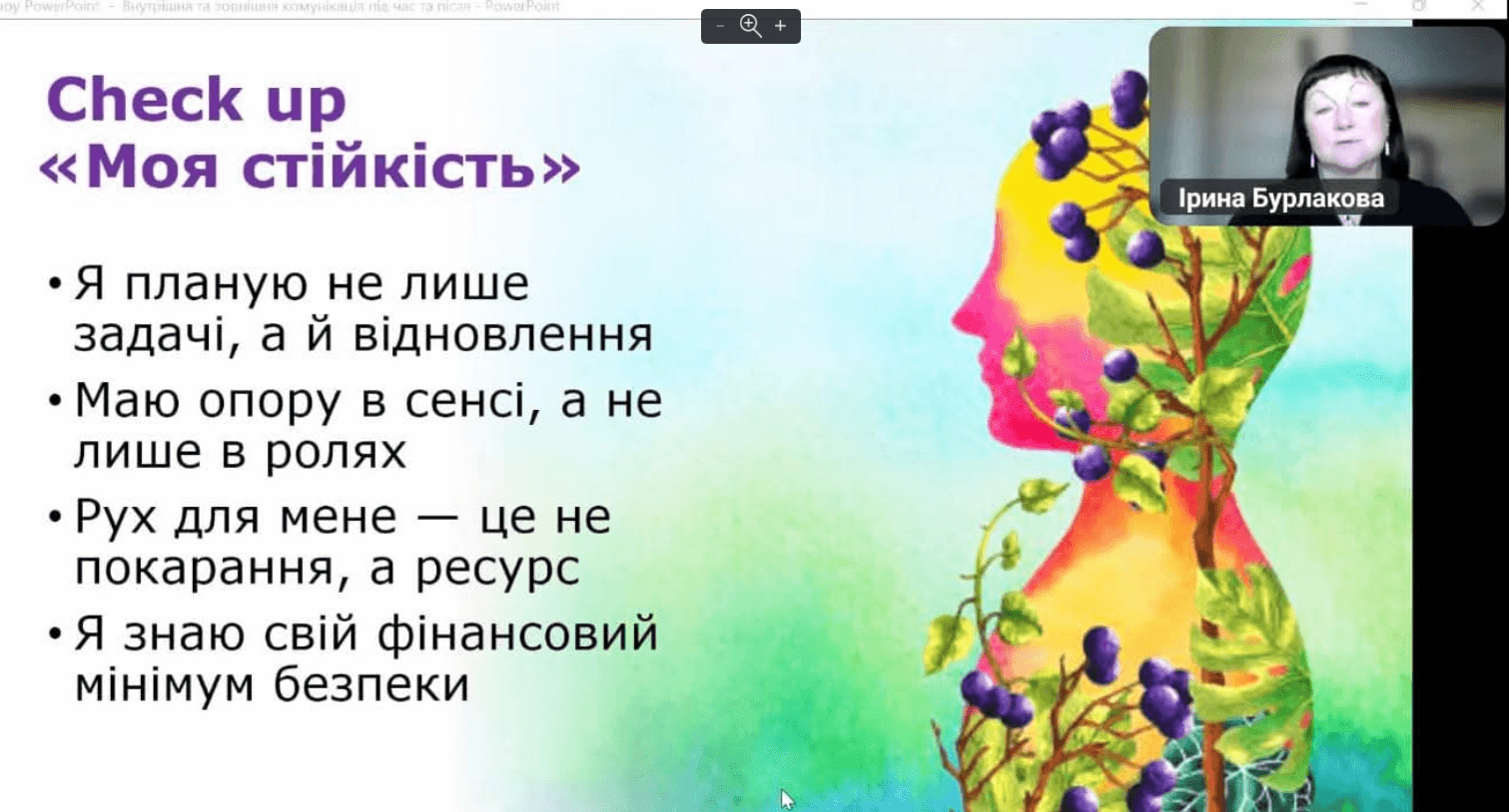 Друга частина – це відновна практика «Коло» – сучасна методика, що сприяє побудові довіри, взаєморозуміння та згуртованості в колективі. Тренер – Ольга Лосієвська, доктор психологічних наук, професорка.