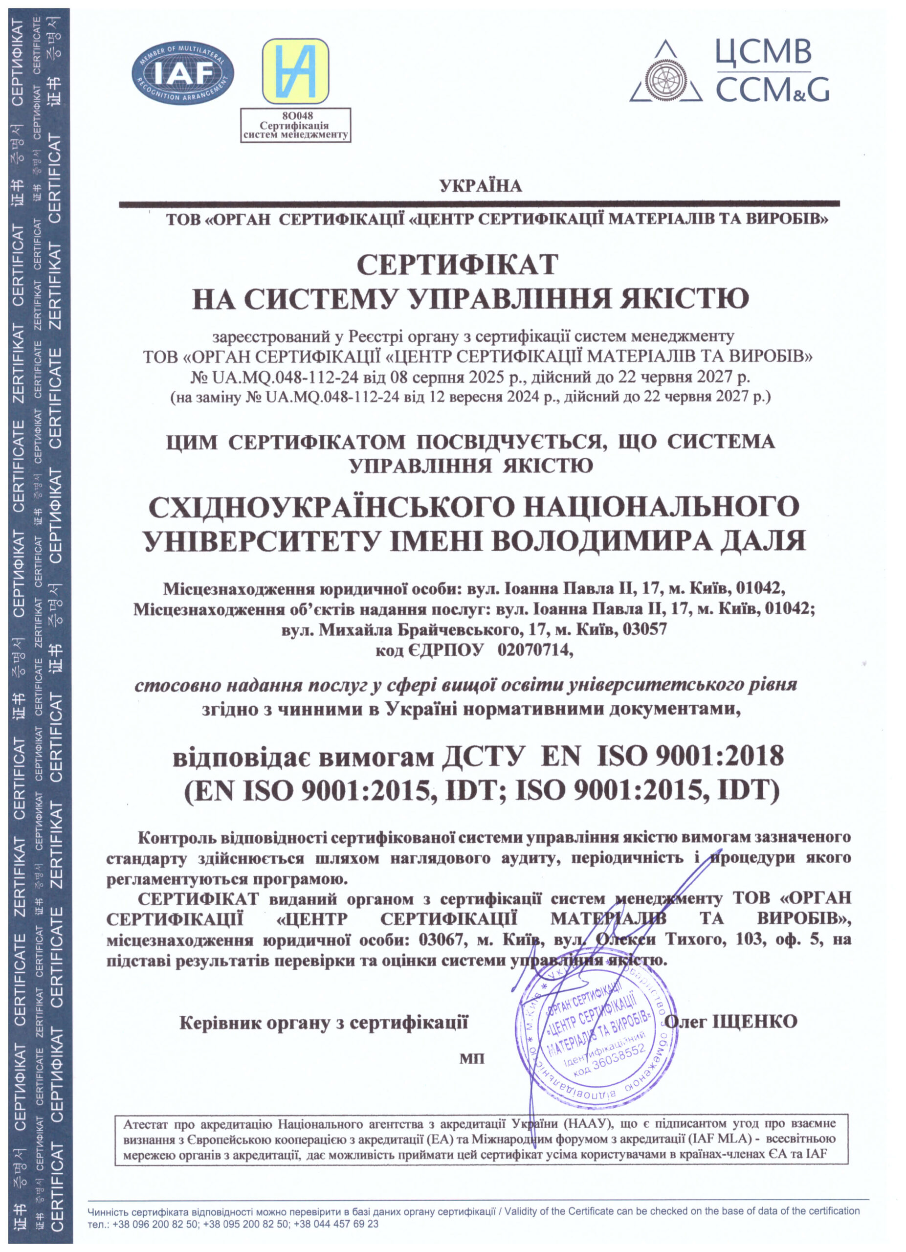 Східноукраїнський національний університет імені Володимира Даля з гордістю повідомляє про успішне проходження наглядового аудиту та підтвердження чинності сертифіката відповідності системи управління якістю (СУЯ) вимогам міжнародного стандарту ДСТУ EN ISO 9001:2018 (EN ISO 9001:2015, IDT; ISO 9001:2015, IDT).