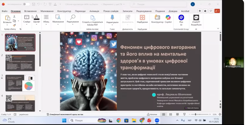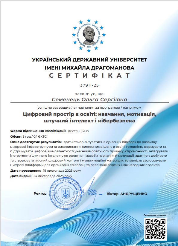 19 листопада 2025 року відбулася дистанційна конференція «Цифровий простір в освіті: навчання, мотивація, штучний інтелект і кібербезпека». Участь у заході взяли викладачки кафедри іноземної філології та перекладу факультету права, гуманітарних та соціальних наук СНУ ім. В. Даля: к.пед.н., доцент О. Г. Гнєдкова, к.пед.н., доцент В. С. Хромова та к.філол.н., доцент О. С. Семенець. Конференція була організована МОН і ПФ УДУ імені Михайла Драгоманова за підтримки ЄАС.