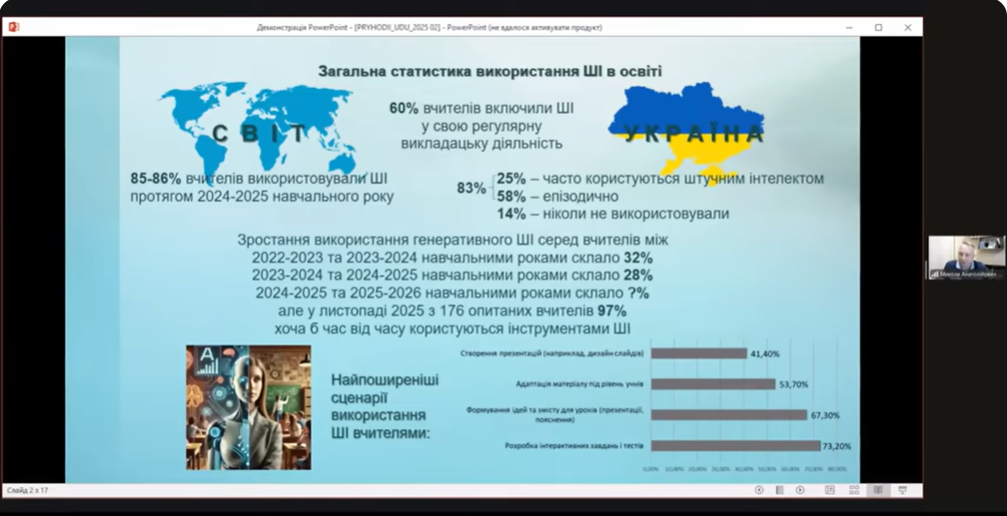 Набуті знання і нові компетентності дозволяють краще зрозуміти ситуацію із застосуванням молоддю інструментів ШІ в навчальному процесі, визначити загрози цифрового вигорання як викладачів/вчителів, так і студентів/учнів, а також удосконалити й урізноманітнити методи викладання фахових дисциплін на випускових спеціальностях кафедри: 035.041 Філологія. Германські мови та літератури (переклад включно), перша – англійська та 014.021 Середня освіта. Англійська мова та зарубіжна література.