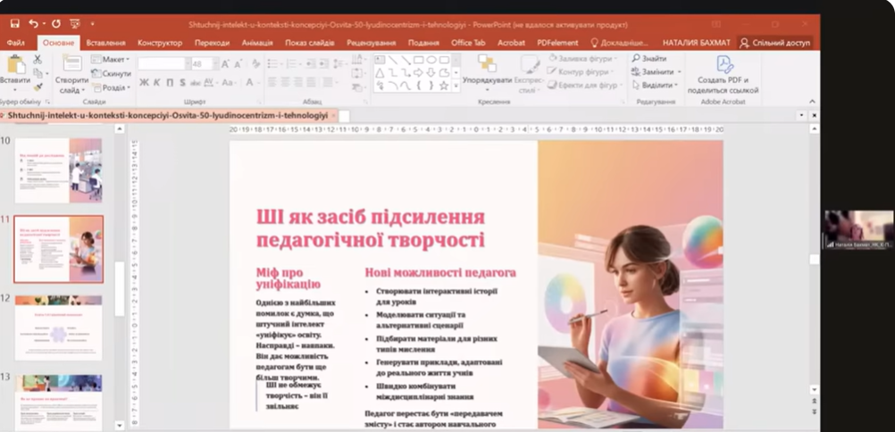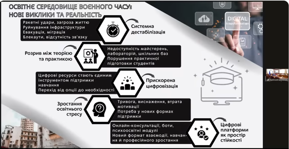 Під час заходу учасниці долучилися до цікавих і актуальних доповідей, які допомогли краще орієнтуватися в сучасних підходах до розвитку цифрової інфраструктури та використання системних рішень в освіті. Спікери поділилися практичними інструментами щодо формування та підтримки цифрових компетентностей учасників освітнього процесу, інтеграції інструментів штучного інтелекту як ефективних засобів навчання й мотивації, а також добору та створення якісного цифрового контенту і мультимедійних матеріалів.