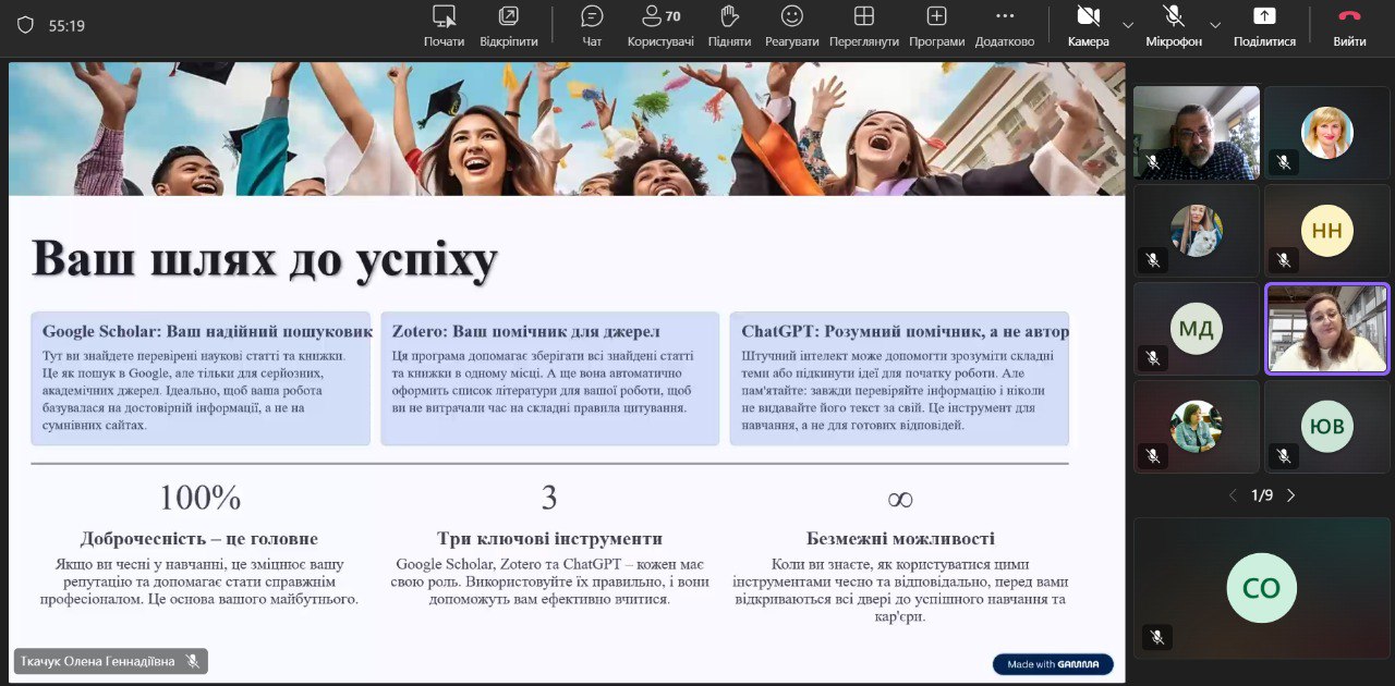 Окрему увагу приділили сервісу Google Scholar, який допомагає працювати з перевіреними джерелами, уникати плагіату та отримувати доступ до наукових матеріалів.