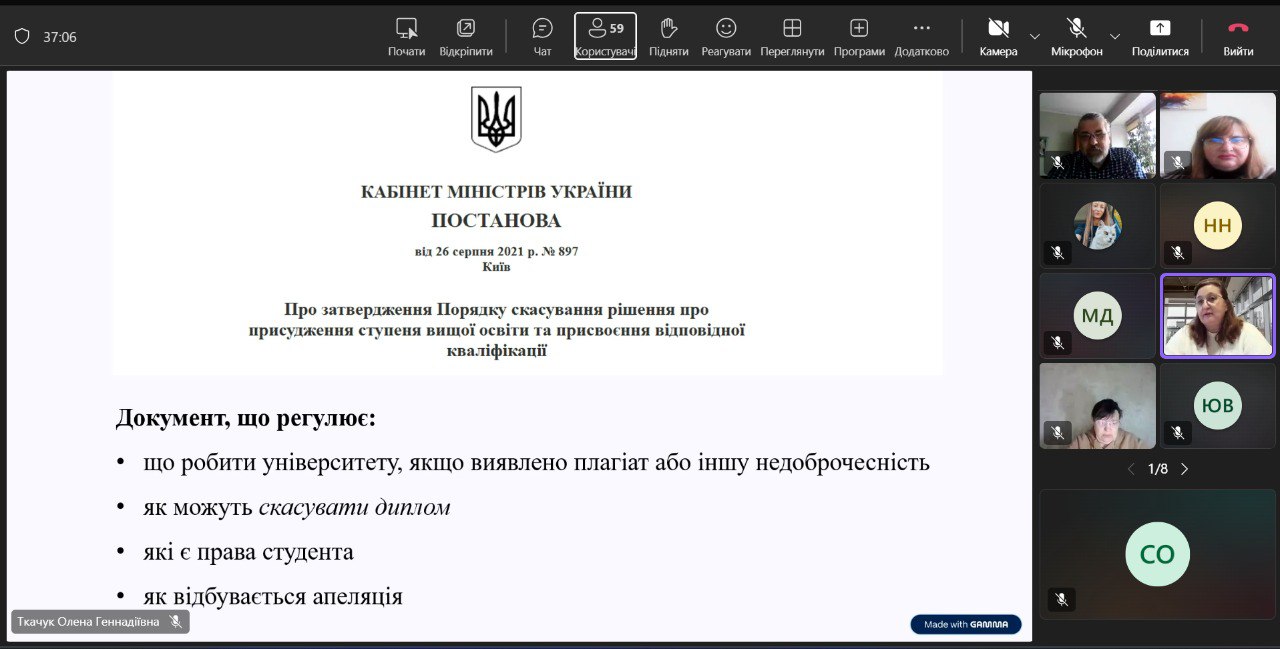 Студентам також розповіли про документ, що регулює скасування рішення про присудження ступеня вищої освіти у разі виявлення плагіату. Наголошено, що анульованим може бути як бакалаврський, так і магістерський диплом.