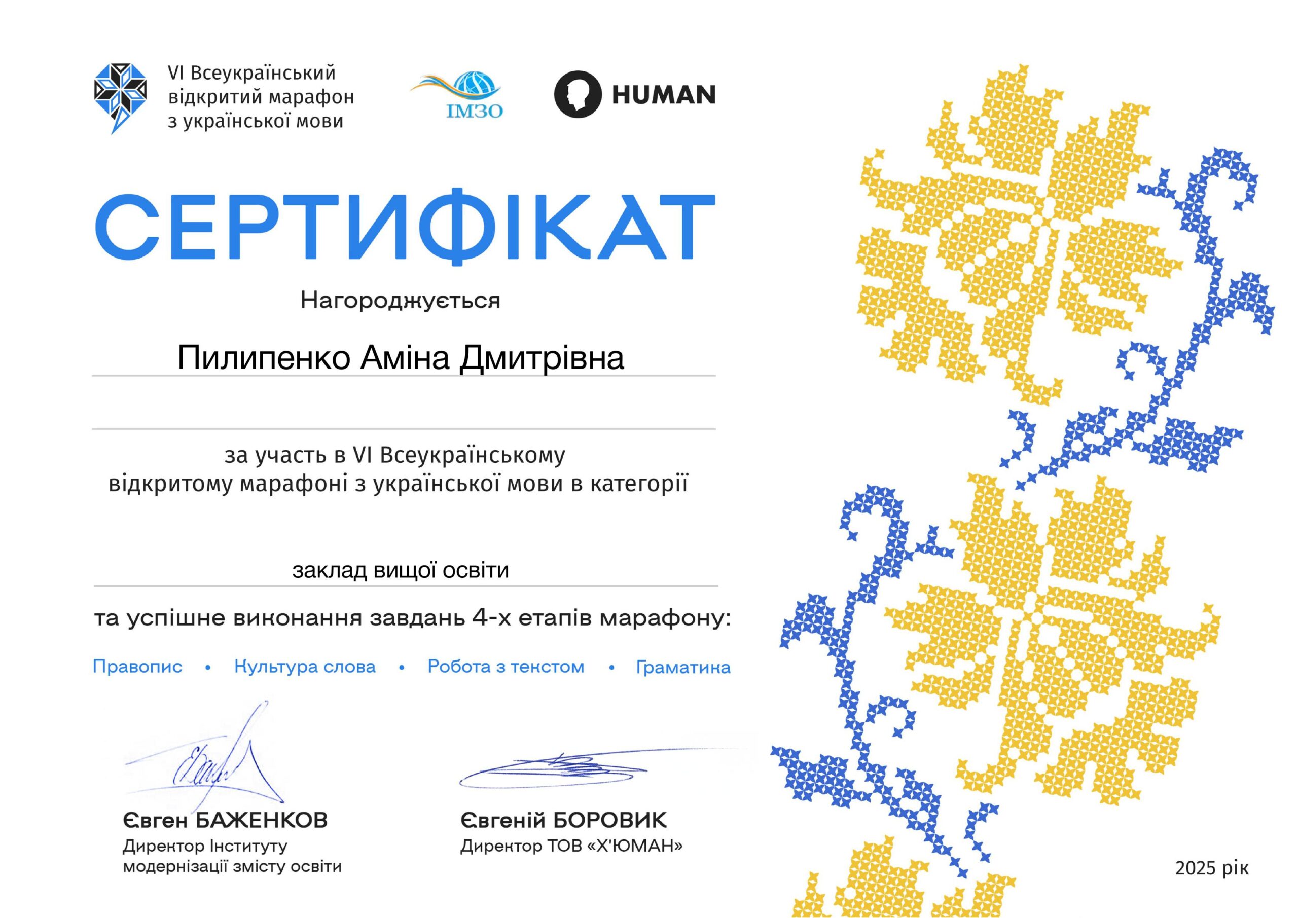 Здобувачі вищої освіти спеціальності «Практична психологія» факультету права, гуманітарних та соціальних наук Східноукраїнського національного університету імені Володимира Даля Аміна Пилипенко та Катерина Шевченко взяли участь у VI Всеукраїнському відкритому марафоні з української мови. Наукова керівниця учасниць — Ірина Глуховцева.