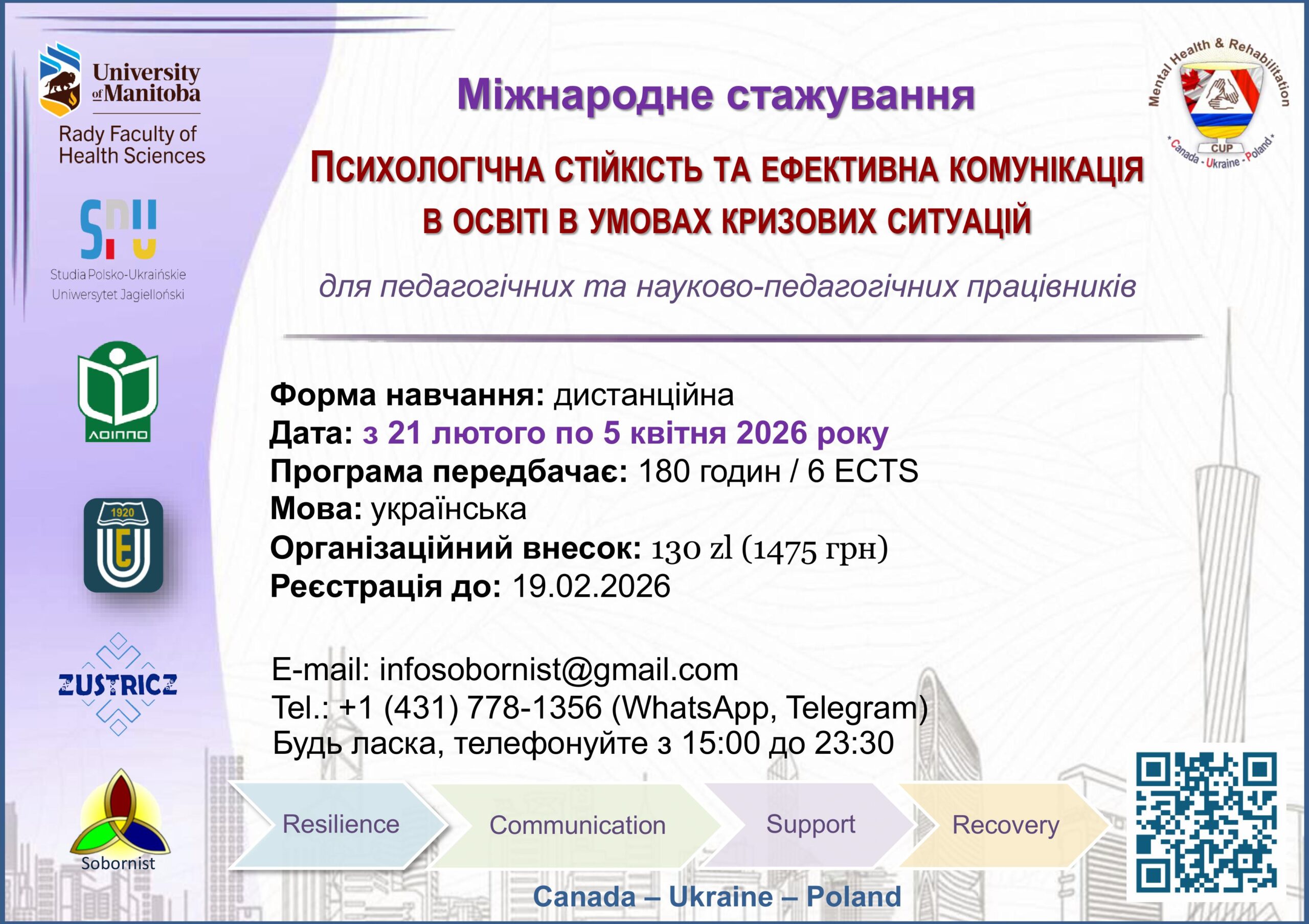 Науково-практичний центр медико-соціальних та психотехнологій (кафедра практичної психології та соціальної роботи факультету права, гуманітарних і соціальних наук СНУ ім. В. Даля) виступає співорганізатором міжнародного онлайн-стажування «Психологічна стійкість та ефективна комунікація в освіті в умовах кризових ситуацій». Метою програми є об’єднання фахівців із різних галузей для розроблення інтегрованих підходів до підтримки психічного здоров’я та реабілітації в умовах війни й інших кризових викликів. Стажування відкрите для педагогічних і науково-педагогічних працівників, а також здобувачів вищої освіти всіх рівнів.