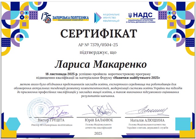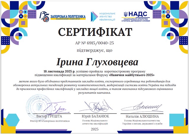 Доцентки кафедри іноземної філології та перекладу факультету права, гуманітарних та соціальних наук СНУ ім. В. Даля Ірина Глуховцева та Лариса Макаренко успішно пройшли програму підвищення кваліфікації за матеріалами Форуму «Навички майбутнього 2025», організованого НУ «Запорізька політехніка» за підтримки Національного агентства кваліфікацій та Національного агентства України з питань державної служби.