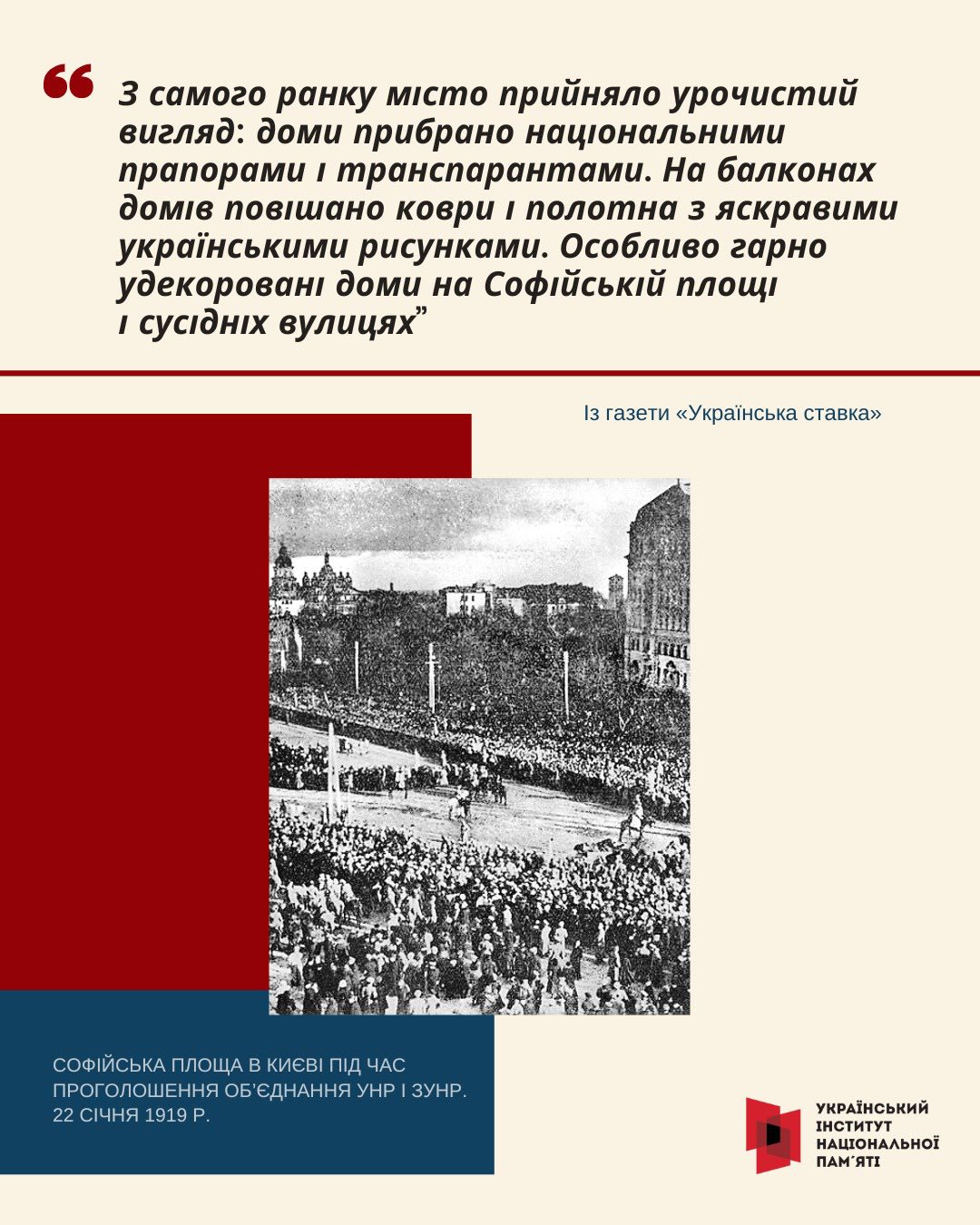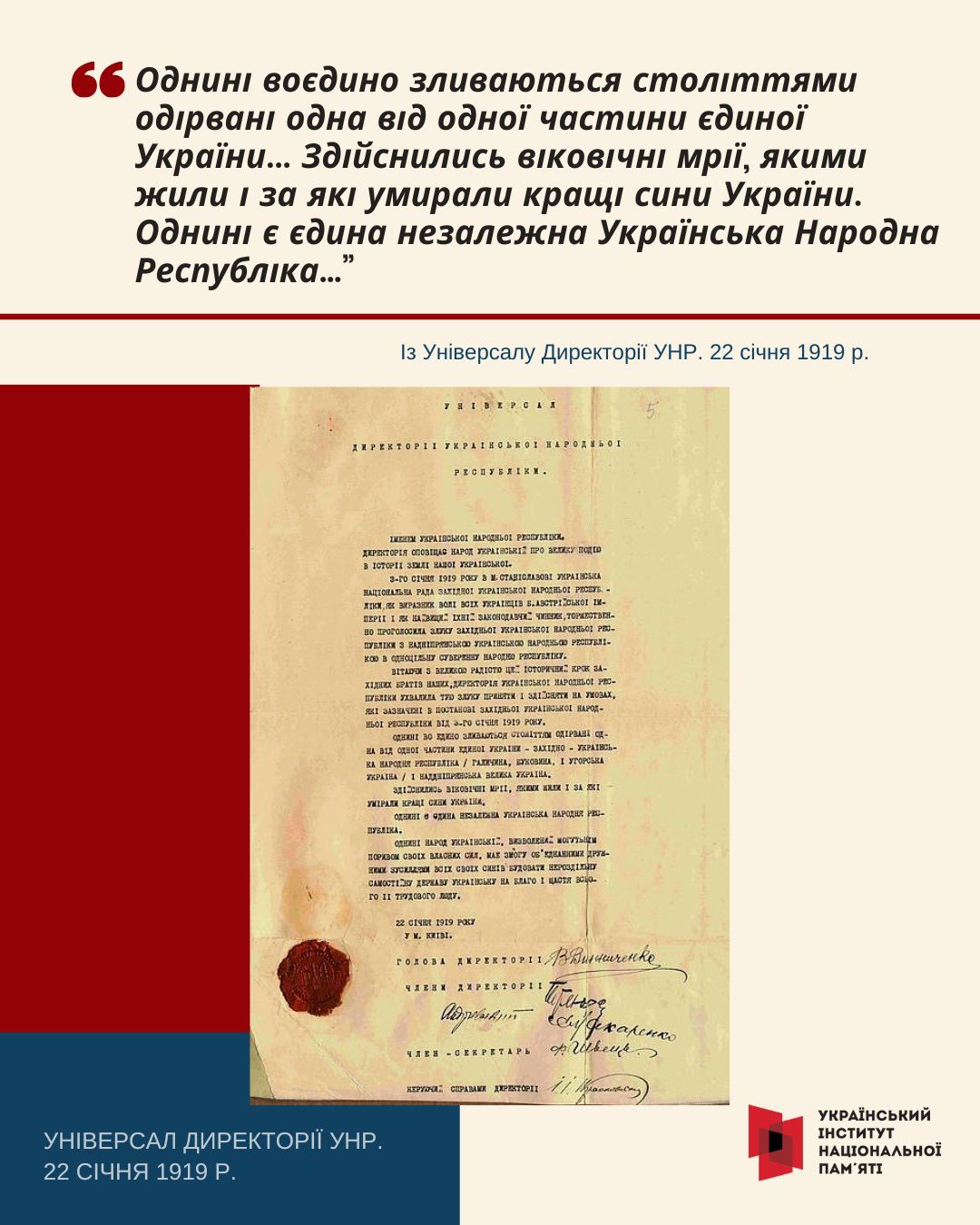 Саме 22 січня 1919 року на Софійському майдані в Києві було проголошено Акт Злуки Української Народної Республіки та Західно-Української Народної Республіки. Універсал Соборності проголошував об’єднання українських земель в єдину незалежну державу — мрію, за яку покоління українців боролися й віддавали життя.