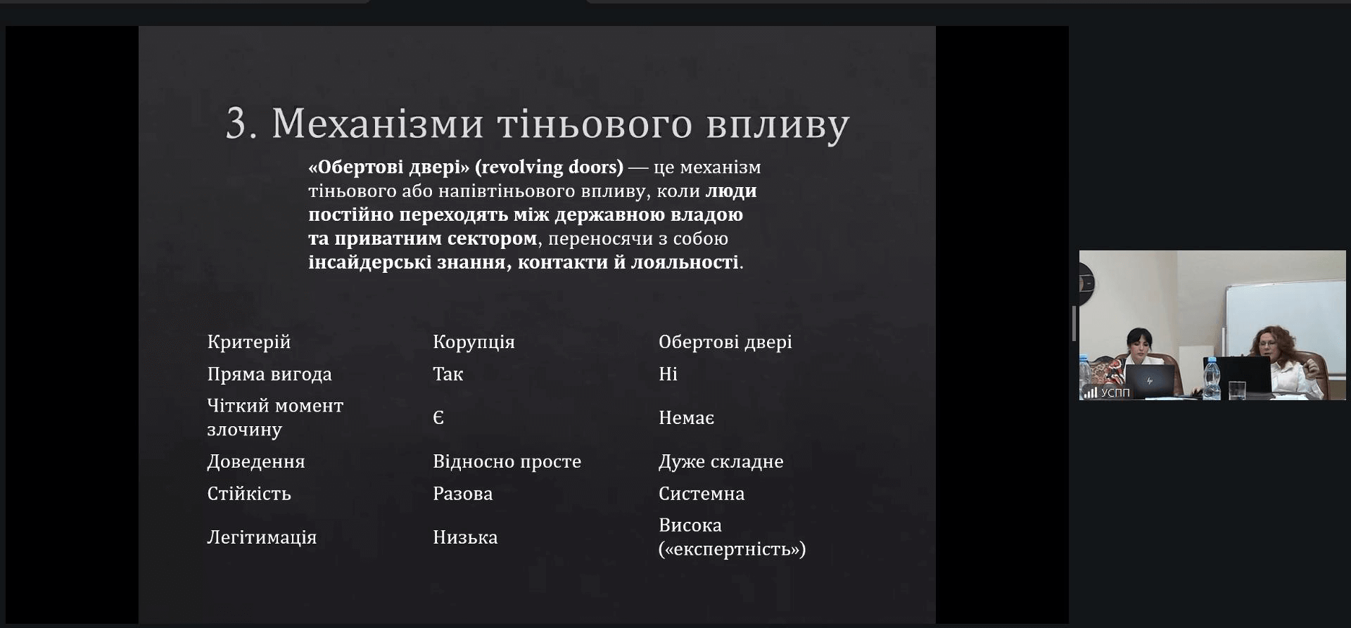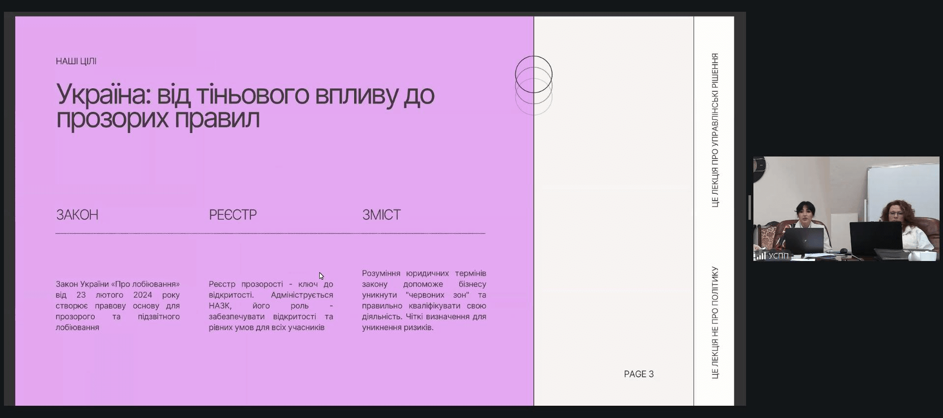 Професійний вимір взаємодії бізнесу й влади було поглиблено в межах лекційного блоку, у якому професор Людмила Кожура представила теоретичні засади та світові практики регулювання лобізму, порівнявши моделі України, США та Великої Британії.