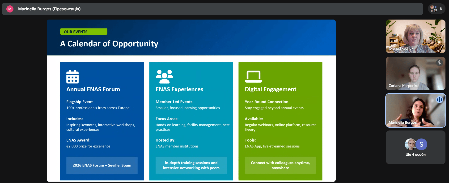 У зустрічі взяли участь президентка ENAS Liesbeth van Vliet-Kruisifikx та менеджерка з розвитку Marinella Burgos. СНУ ім. В. Даля представляли проректор з науково-педагогічної роботи, економіки і розвитку Руслан Галгаш, керівниця відділу міжнародного співробітництва Олена Середіна, в.о. декана факультету здоров’я людини Олена Ткачук та завідувач кафедри фізичної культури і спорту Сослан Адирхаєв.