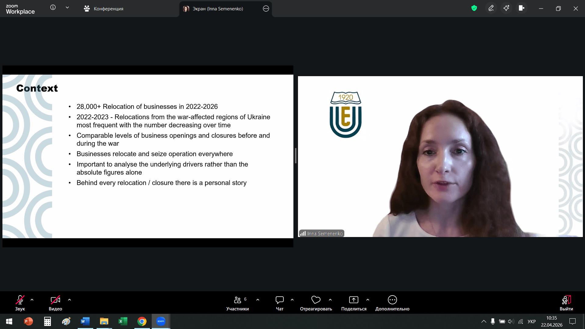 У межах своєї доповіді Інна Семененко представила результати аналітичної роботи та рекомендації, що стосуються підтримки переміщеного бізнесу, освітньо-консультаційного супроводу підприємців і посилення взаємодії між університетом, бізнесом та громадами. У своїх пропозиціях вона також акцентувала увагу на Концепції інноваційно-освітньої екосистеми розвитку людського потенціалу Луганщини на базі університету, яка передбачає системну інтеграцію освітньої, дослідницької та практичної складових, зокрема компонента, пов’язаного з переміщеним бізнесом. Такий підхід відповідає стратегічному баченню університету як платформи, що об’єднує освіту, науку, громаду та підприємницьке середовище задля формування стійких механізмів регіонального відновлення.
