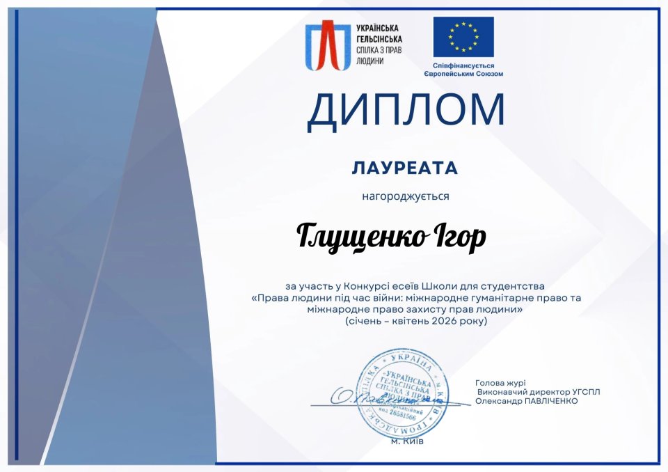Східноукраїнський національний університет імені Володимира Даля продовжує формувати нове покоління правників, здатних відповідати на складні виклики сучасності. Вагомим підтвердженням цього є успіх здобувача вищої освіти спеціальності «Право» факультету права, гуманітарних і соціальних наук СНУ ім. В. Даля Ігоря Глущенка, який вийшов у фінал конкурсу есе Школи для студентства «Права людини під час війни: міжнародне гуманітарне право та міжнародне право захисту прав людини».