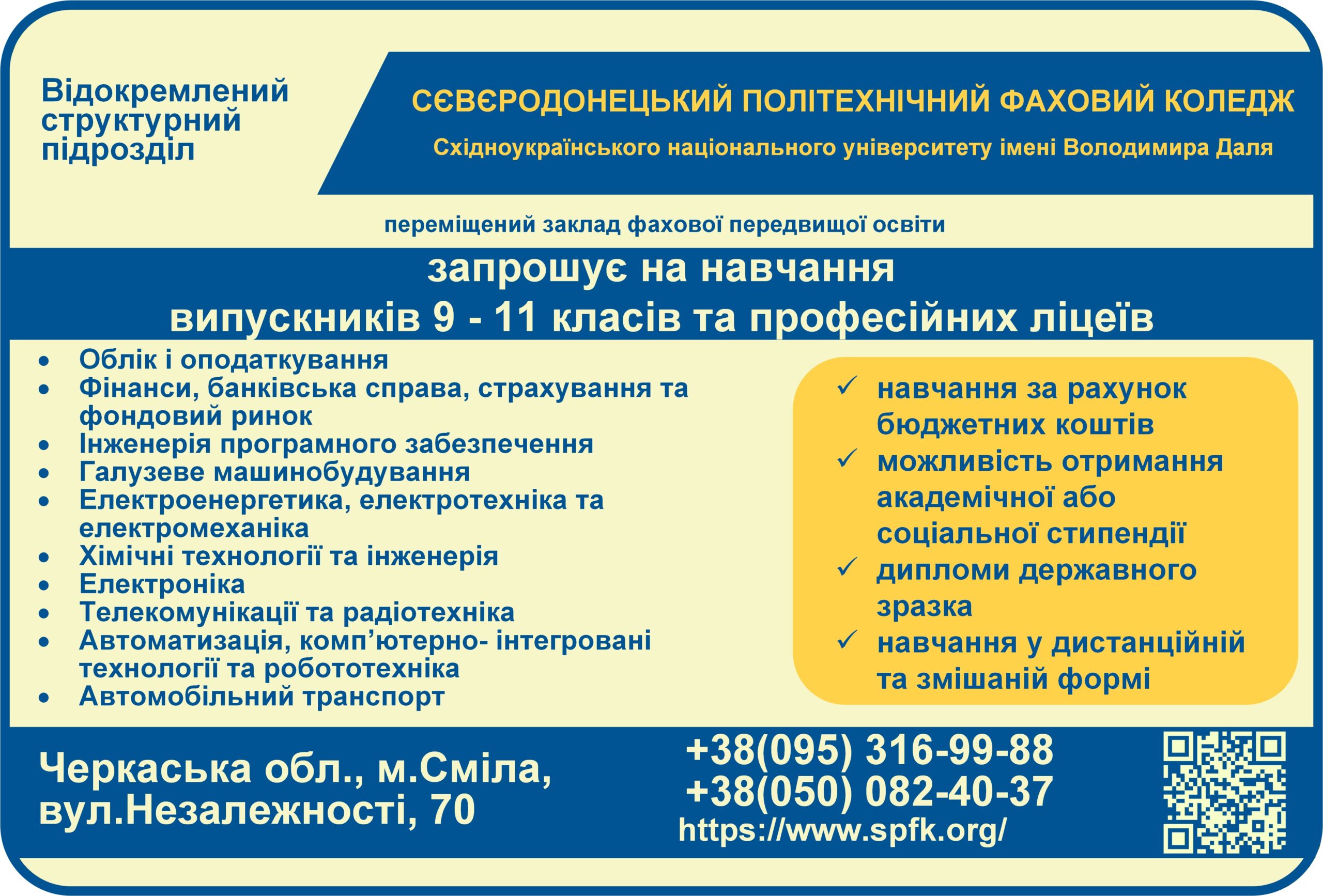 Якщо Ви маєте бажання вчитися та отримати сучасну професію, твердо зорієнтовані на успіх і благополуччя, готові зробити перший крок до своєї мети, то ми завжди чекаємо Вас у Сєвєродонецькому політехнічному фаховому коледжі.